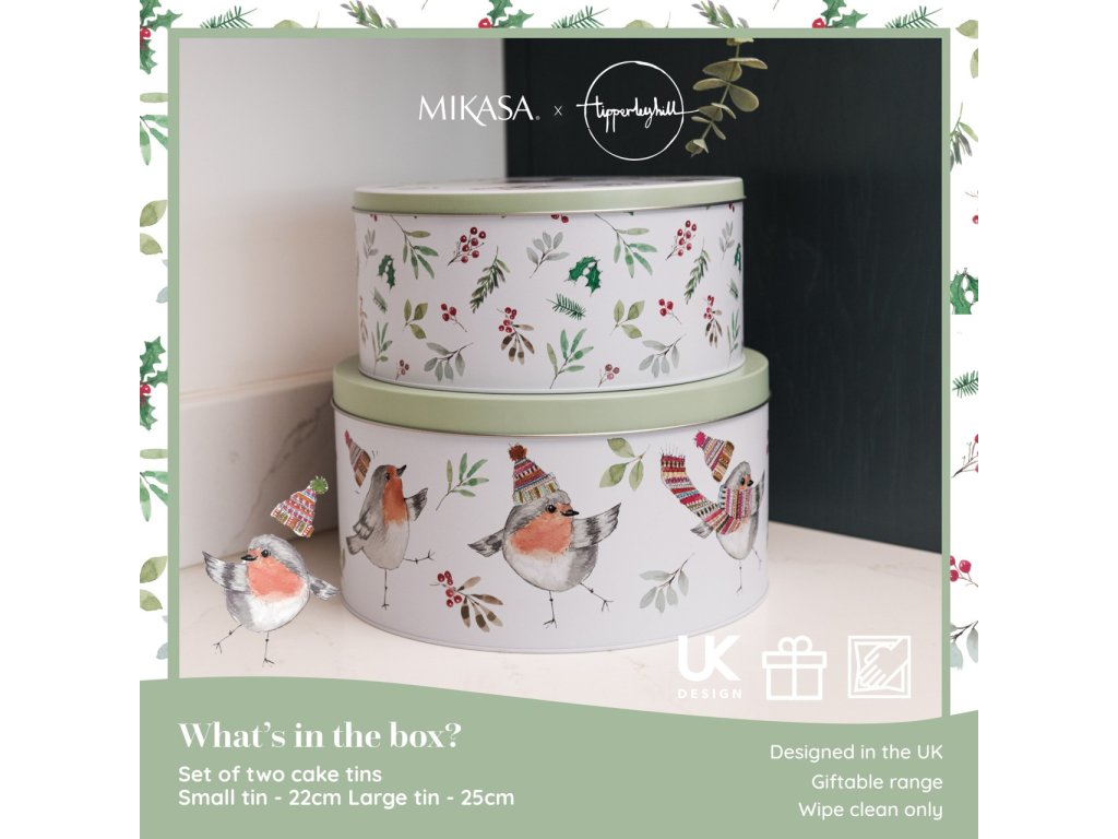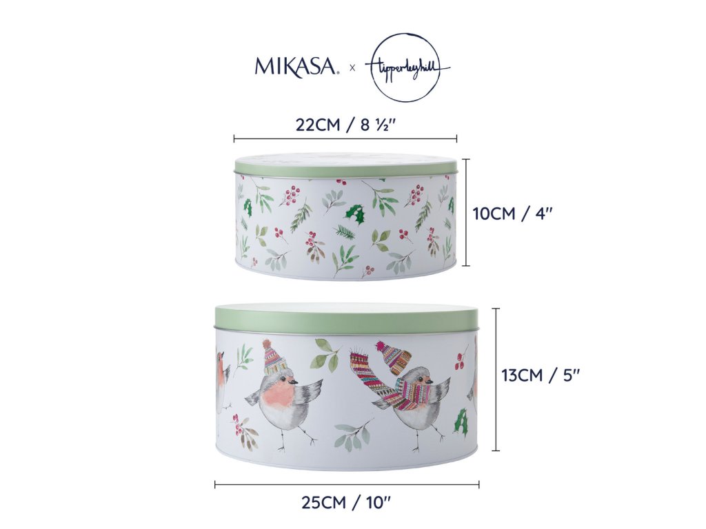 | Klíčové vlastnosti: | Sada dvou plechových dóz Mikasa Tipperleyhill s jemným motivem zimního ptáčka. Velikosti 22×10 a 25×13 cm, ideální na cukroví, sušenky i sváteční dobroty. |