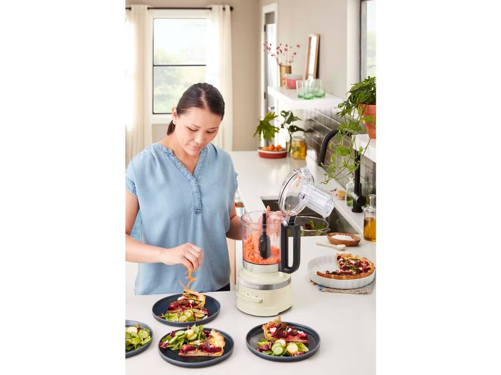 Food processor KitchenAid 5KFP0921 je univerzální kuchyňský pomocník, který usnadní každodenní přípravu surovin. Je navržen tak, aby zvládal široké spektrum úkolů – od sekání bylinek a ořechů přes krájení a strouhání zeleniny až po hnětení těsta nebo přípravu omáček, pyré a dipů.