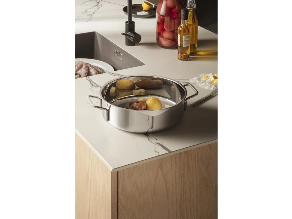 Díky vyšším stěnám je pánev ideální pro míchání a redukci omáček, restování většího množství surovin nebo přípravu pokrmů, které vyžadují postupné přidávání tekutin. Tvar pánve umožňuje pohodlnou práci bez rozstřiku a lepší manipulaci s obsahem.