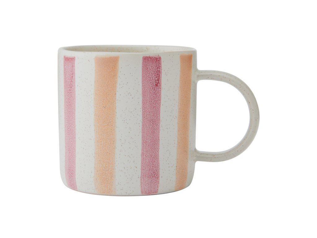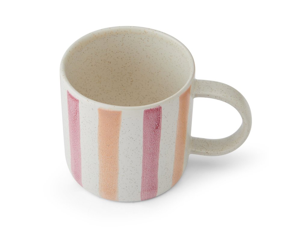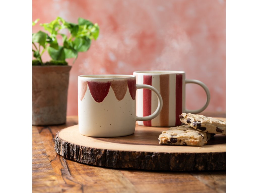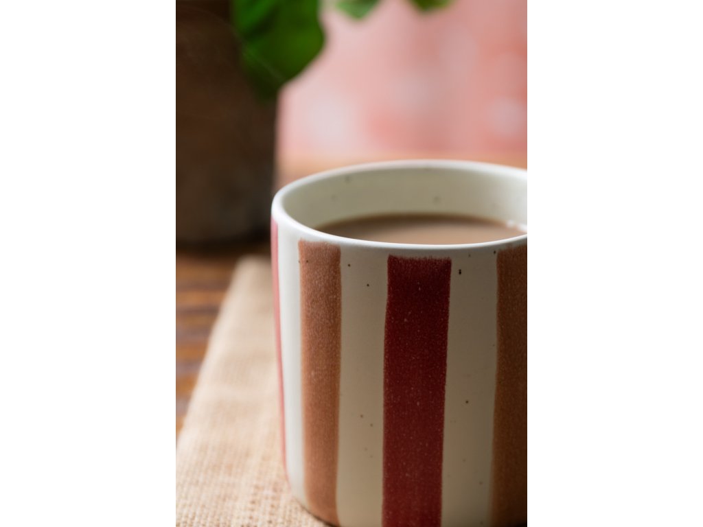 Dekor v podobě svislých pruhů v růžových a červených tónech nepůsobí výrazně ani rušivě. Naopak dodává hrnku osobitost, aniž by narušoval klidný charakter stolování. Díky tomu se hodí jak jako samostatný kus, tak v kombinaci s dalšími hrnky nebo jednoduchým kameninovým nádobím.