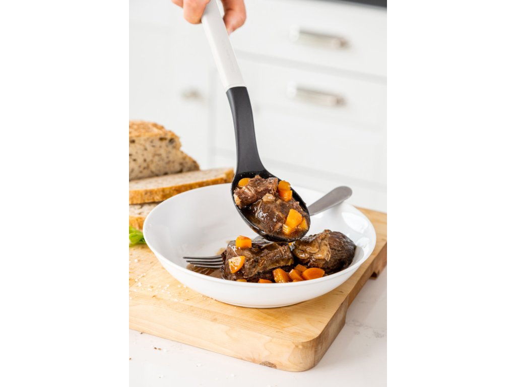 Lžíce na vaření KitchenAid 34 cm v porcelánově bílé barvě je všestranný kuchyňský pomocník, který ti pomůže při přípravě polévek, omáček, dušených i restovaných pokrmů. Díky své délce pohodlně dosáhneš i na dno hlubokých hrnců a pánví, zatímco ergonomická rukojeť zajišťuje jistý úchop bez únavy ruky.