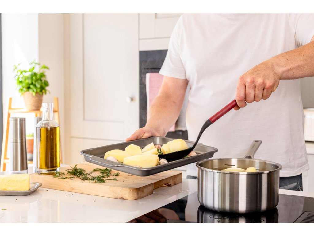 Díky délce 34 cm pohodlně dosáhneš i na dno hlubokých hrnců, zatímco ergonomicky tvarovaná rukojeť poskytuje pevný a pohodlný úchop i při delší práci v kuchyni. Lžíce se hodí pro polévky, omáčky, dušená masa i zeleninu, ale výborně poslouží i při odstraňování tekutin z vařených ingrediencí.
