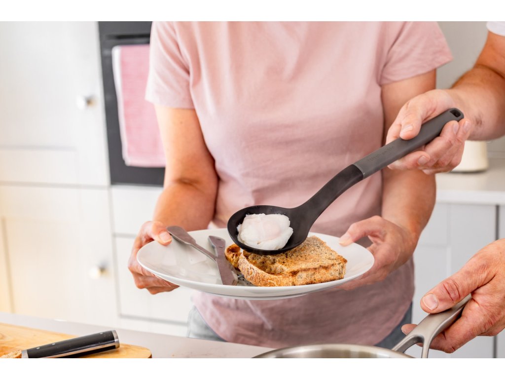 Uhlově šedá perforovaná lžíce na vaření KitchenAid 34 cm je všestranný nástroj do každé kuchyně, který ti pomůže při servírování polévek, omáček, dušených jídel a dalších pokrmů, kde je třeba oddělit tekutinu od pevné části jídla. Díky průřezům v pracovní části efektivně oddělíš vývar či omáčku od ingrediencí a servíruješ přesné porce bez nežádoucích kapek.
