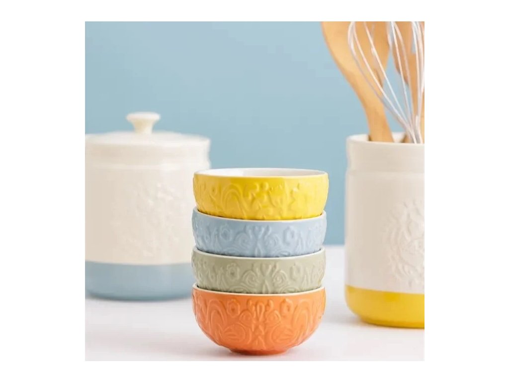Tato sada čtyř menších misek z kolekce Home To Roost přináší praktické a dekorativní řešení pro vaši kuchyni. Každá miska má objem 200 ml, což je ideální velikost pro přípravu ingrediencí, dipů, omáček nebo menších dezertů. Barevný mix (oranžová, modrá, zelená, žlutá) a jemný reliéf s motivem domácích ptáků dodá vaší kuchyni veselý a stylový vzhled.