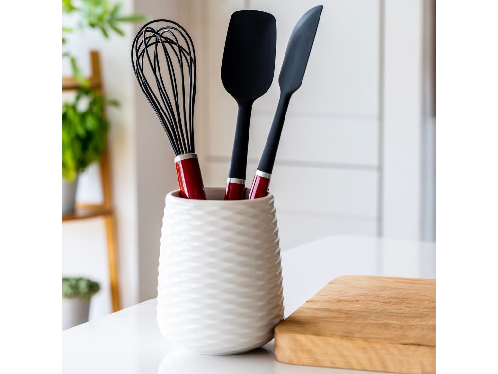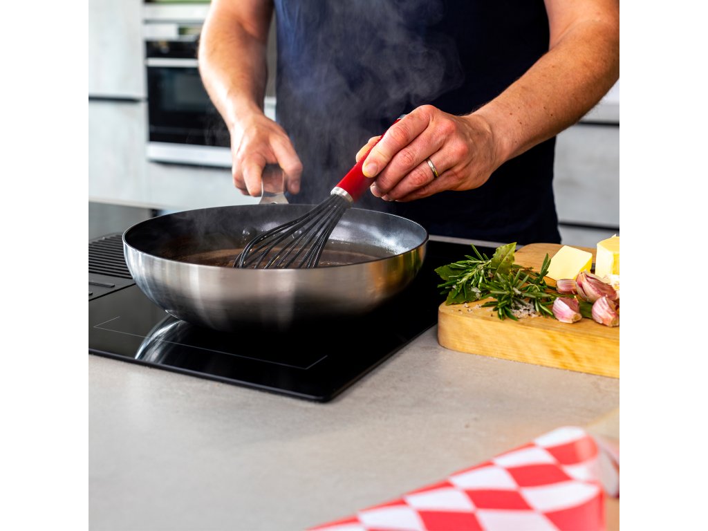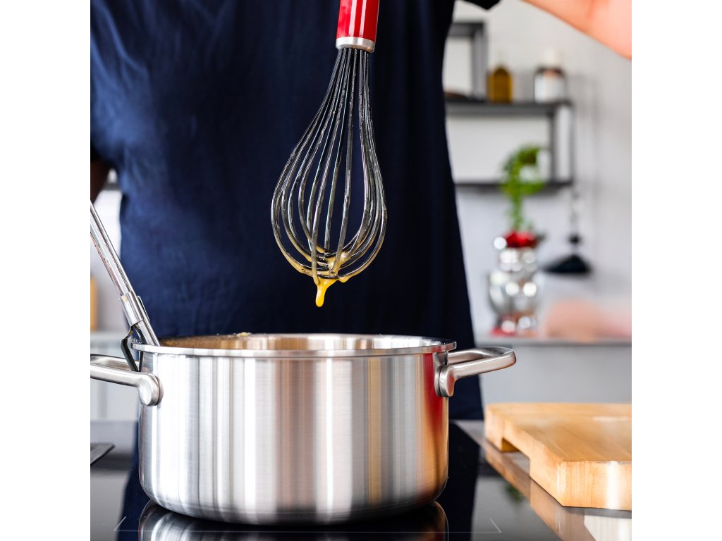 Tato silikonová šlehací metla od KitchenAid v červené barvě Empire Red nabízí perfektní kombinaci stylu a funkčnosti. Její silikonové dráty jsou šetrné k vašim pánvím a nádobí s nepřilnavým povrchem, což znamená, že se nemusíte obávat poškrábání. Ergonomická rukojeť poskytuje pohodlné držení i při delším používání, a proto je ideální pro přípravu omáček, krémů, vajec nebo lehkých těst.