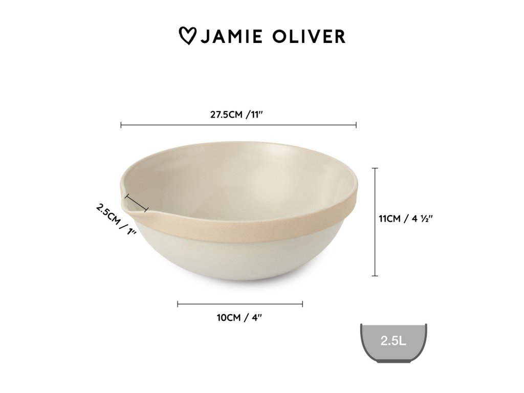 Velká kuchyňská mísa 2,5 l Jamie Oliver Big Love je univerzální pomocník, který v kuchyni rychle získá své pevné místo. Díky velkorysému objemu se hodí pro přípravu těst, míchání surovin, saláty i servírování při stolování. Kameninové provedení dodává míse stabilitu, příjemnou hmotnost a dlouhou životnost při každodenním používání.