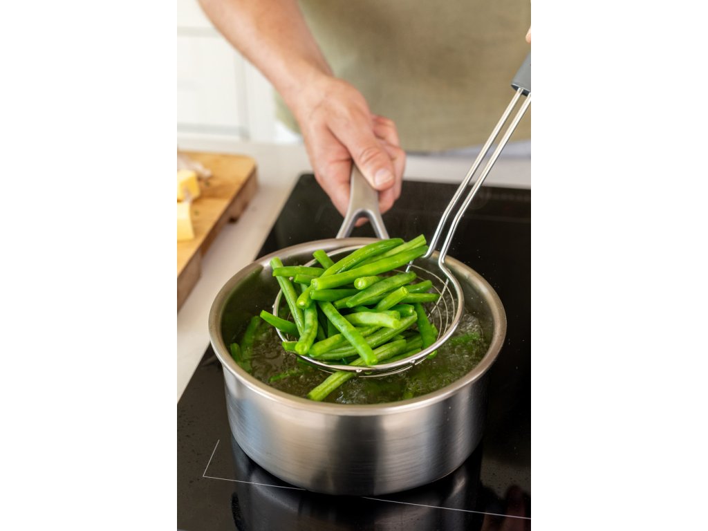 Ergonomicky tvarovaná rukojeť poskytuje pohodlný úchop i při delší práci a její délka 36,5 cm ti umožní bezpečně dosáhnout až na dno hlubokých hrnců či pánví. Drátěná konstrukce je robustní a zároveň dostatečně flexibilní, aby sloužila jak při běžném vaření, tak při slavnostních přípravách.