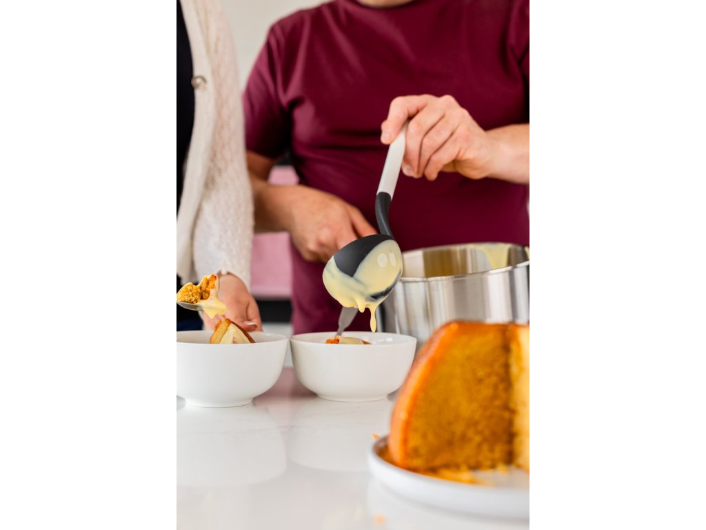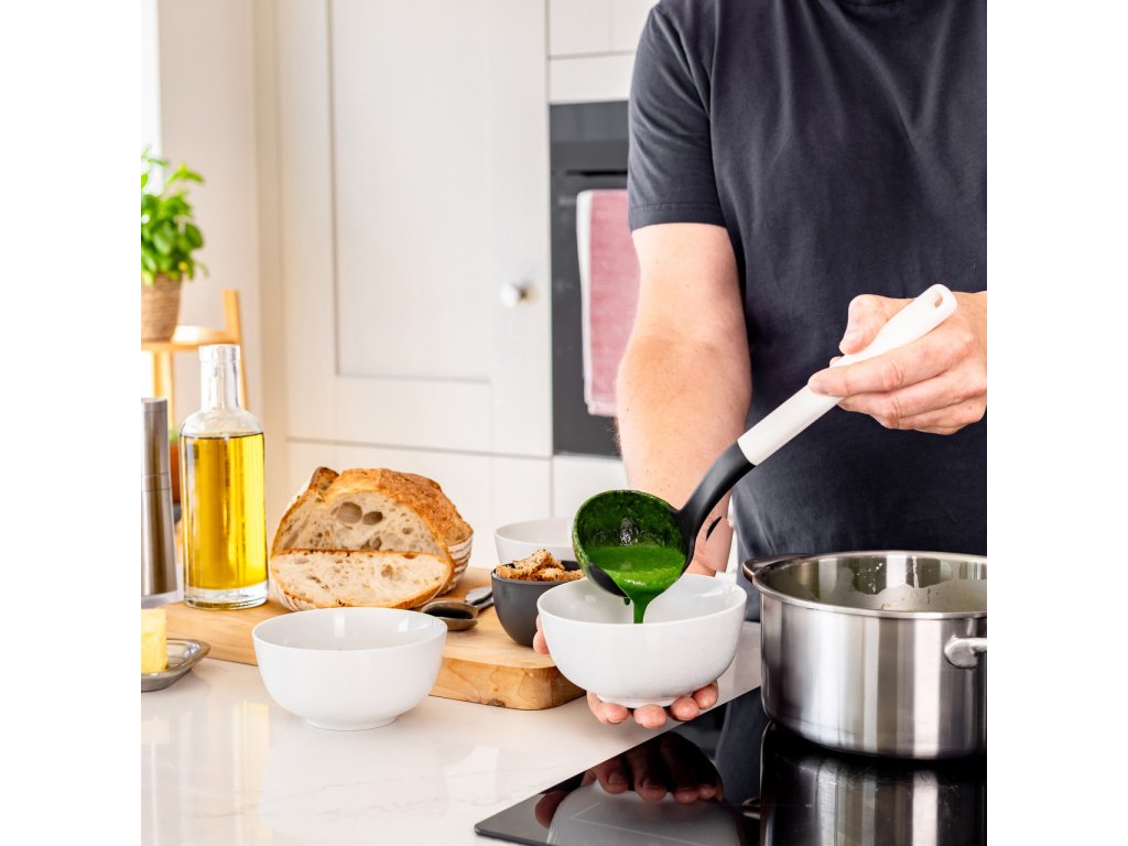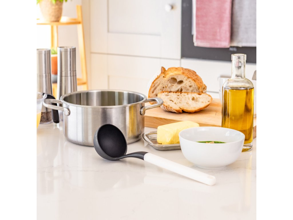 Ergonomická rukojeť poskytuje jistý úchop a příjemný pocit při manipulaci, a porcelánově bílá barva dodává kuchyni svěží, nadčasový vzhled. Naběračka je kompatibilní se všemi typy nádobí, bezpečná pro nepřilnavé povrchy a lze ji snadno čistit v myčce nádobí.