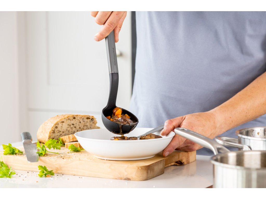Naběračka KitchenAid v uhlově šedé barvě je nenahraditelným nástrojem pro servírování polévek, omáček, dušených pokrmů i dalších tekutých jídel. Díky hluboké misce snadno nabere potřebné množství a ergonomická rukojeť zajišťuje pohodlné držení i při intenzivnějším použití.