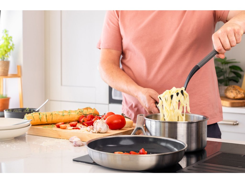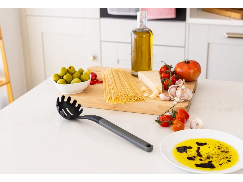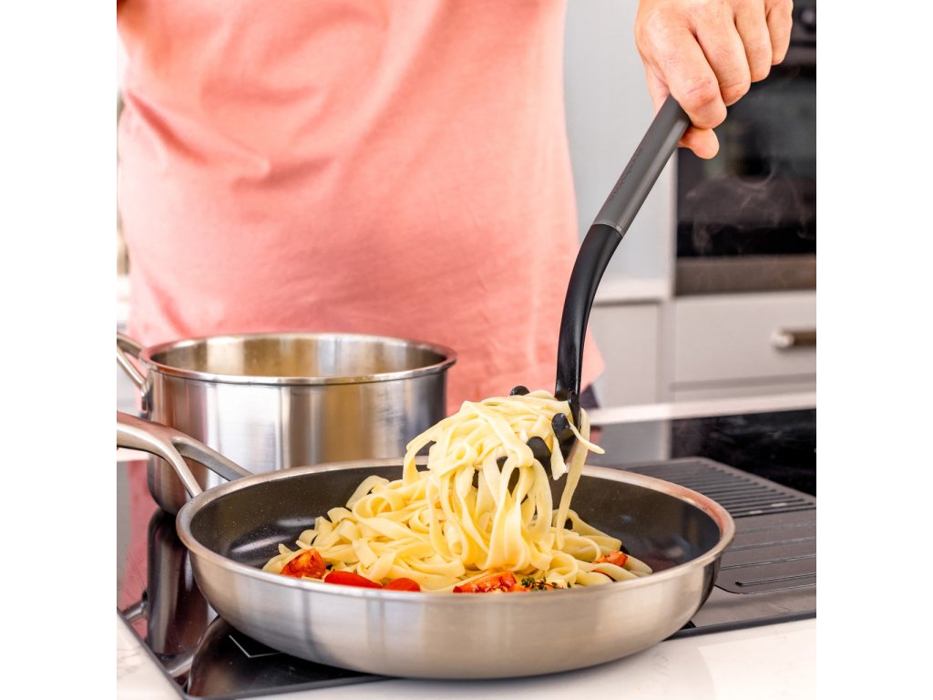 Uhlově šedá naběračka na těstoviny KitchenAid 34 cm je praktický a odolný pomocník pro servírování všech druhů vařených těstovin. Díky speciální struktuře hlavy snadno uchopíš špagety, linguine nebo jiné dlouhé těstoviny bez nechtěného ztrácení kousků nebo vody.