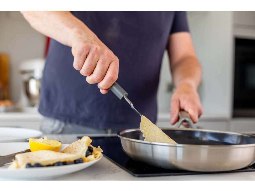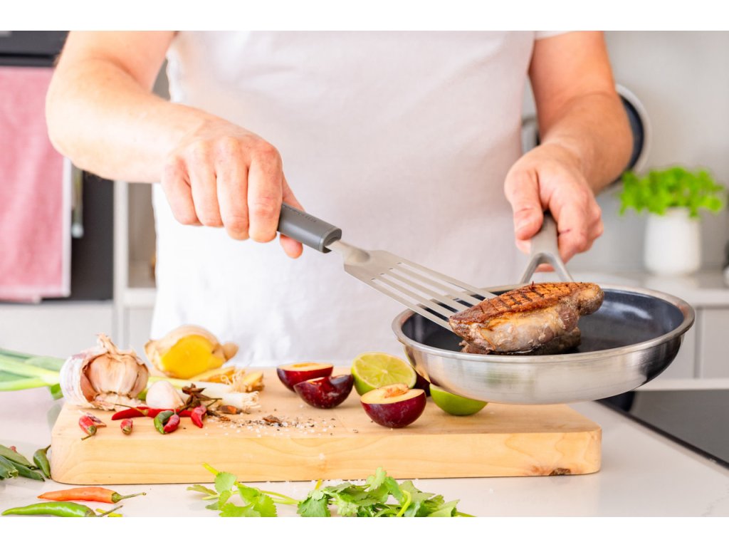 Ergonomicky tvarovaná rukojeť v uhlově šedé barvě poskytuje pevný a pohodlný úchop i při delší práci. Díky své délce je obracečka ideální pro práci s většími pánvemi a plechy a díky flexibilitě materiálu ji využiješ jak u klasických jídel, tak u grilovaných pokrmů.