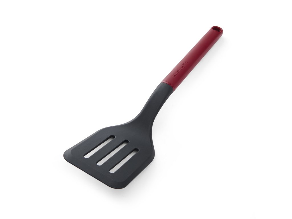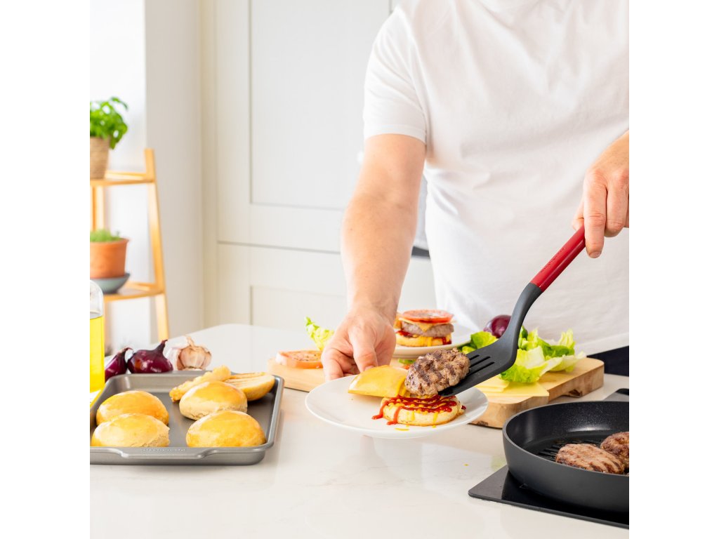 Červená obracečka s drážkami KitchenAid 34 cm je praktický a výrazný nástroj pro obracení pokrmů, kde chcete oddělit tekutiny od servírované porce. Drážky na pracovní části umožňují efektivní odkapávání šťávy nebo tuku při manipulaci s masem, zeleninou nebo těstovinami.