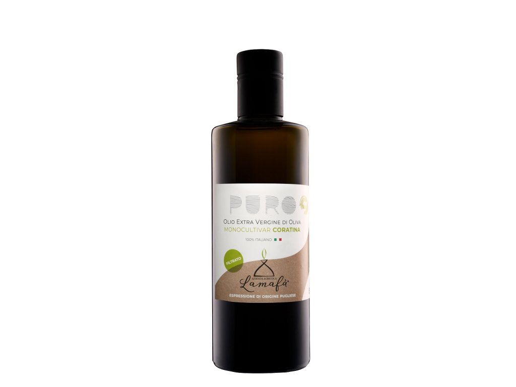 PURO je extra panenský olivový olej vyrobený v Apulii z jediné odrůdy Coratina. Jedná se o olej z čerstvé sklizně, určený především pro studenou kuchyni a finální dochucování.