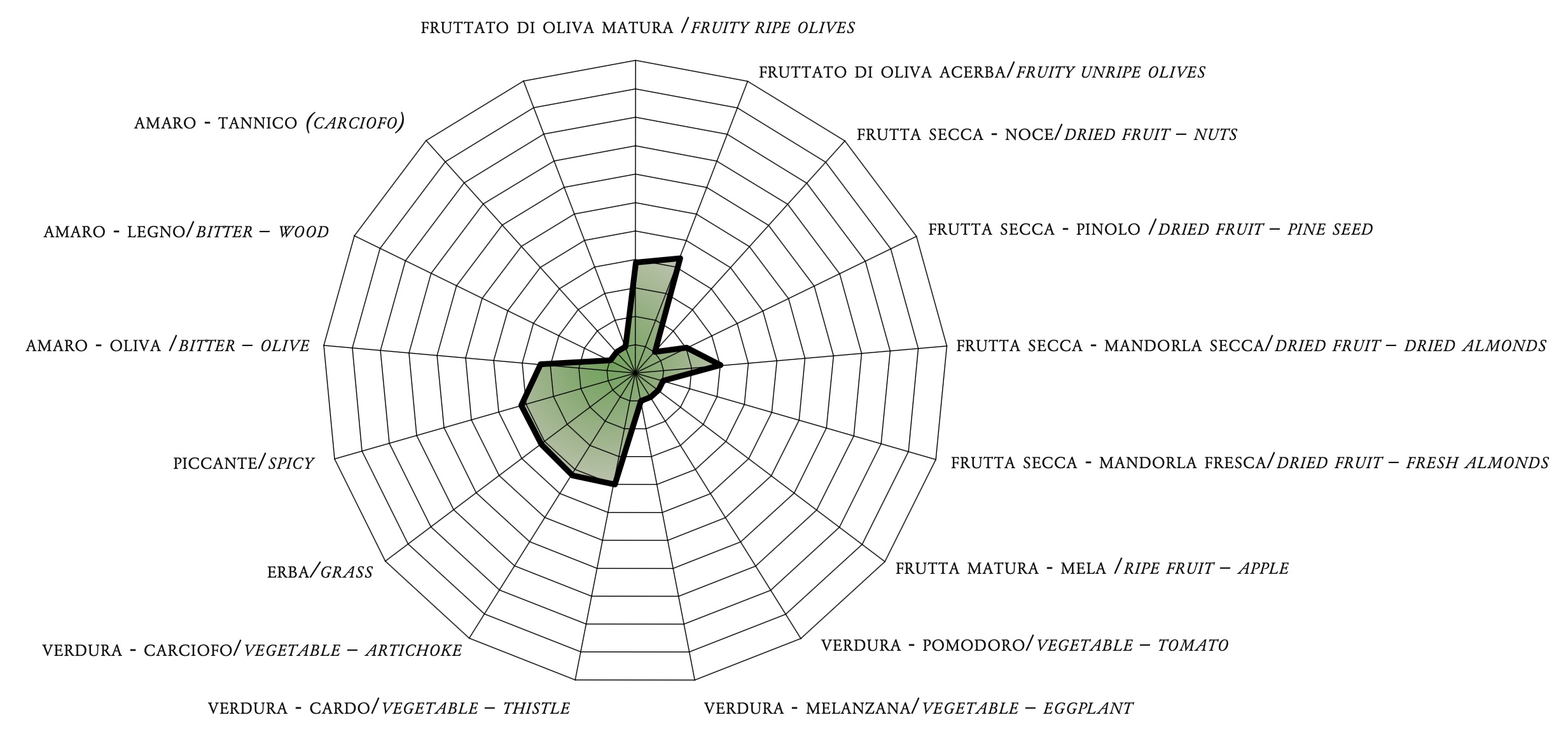 - Vůně: jemně ovocná, s harmonickým aroma čerstvě zralých oliv a měkkými bylinnými tóny.