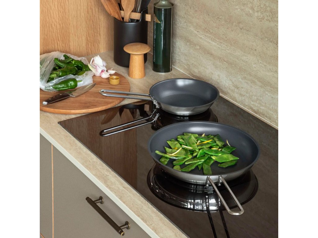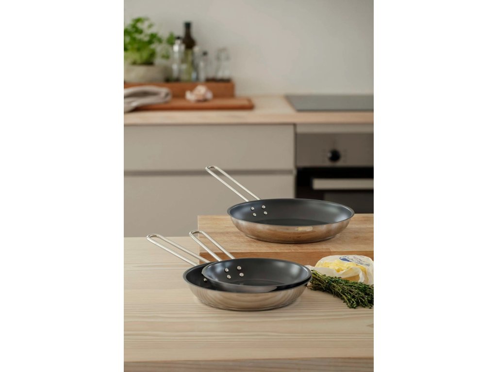 Tato pánev spojuje technickou odolnost, stabilní nepřilnavost a nadčasový nerezový charakter do jednoho vyváženého nástroje pro každodenní použití.