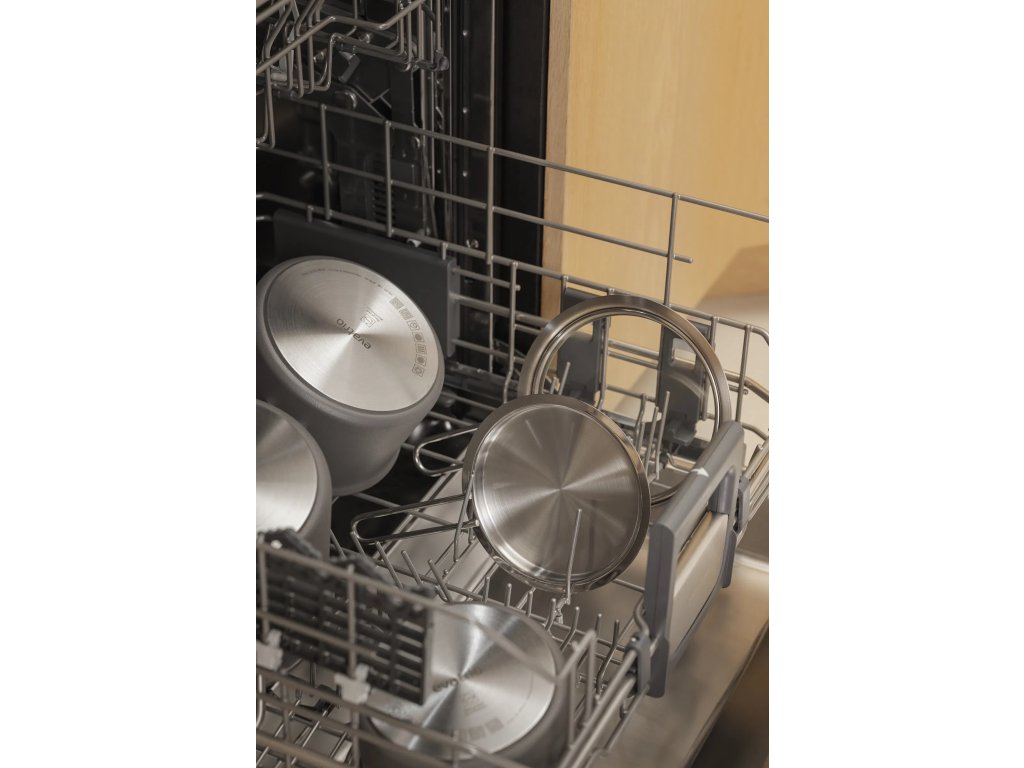 Ocelová část poklice je vyrobena z 90 % recyklované nerezové oceli z post-consumer zdrojů, která zajišťuje vysokou odolnost, dlouhou životnost a čistý technický vzhled. Standardizované rozměry řady Eva Trio umožňují poklici kombinovat se všemi hrnci a pánvemi stejného průměru napříč různými materiálovými řadami. Poklice je stohovatelná nebo ji lze zavěsit, čímž šetří místo v kuchyni.