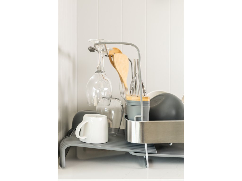 Konstrukce je stabilní a pevná, určená pro každodenní používání. Talíře, misky i hrnky drží bezpečně na svém místě a voda je efektivně odváděna zpět do dřezu, takže pracovní deska zůstává suchá a bez nežádoucích stop. Součástí odkapávače je také samostatný držák na sklenice, který umožňuje bezpečné sušení skleněného nádobí ve svislé poloze, bez rizika převržení nebo kontaktu s tvrdým povrchem.