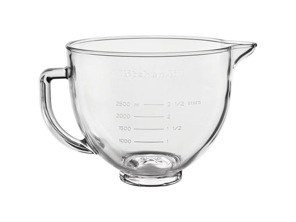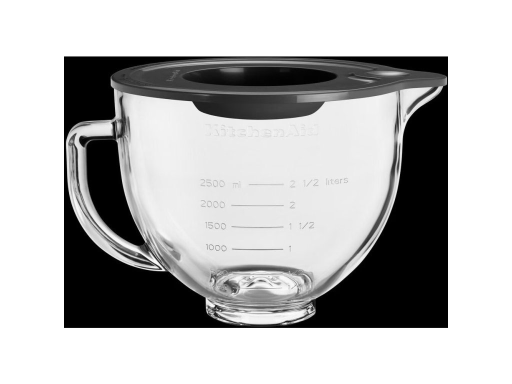 Skleněná mísa KitchenAid 5KSM5GB o objemu 4,8 litru představuje stylovou a zároveň velmi praktickou alternativu ke klasické nerezové míse. Průhledné sklo umožňuje během práce sledovat strukturu těsta nebo krému, takže máte dokonalý přehled o každé fázi přípravy.