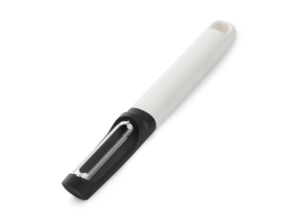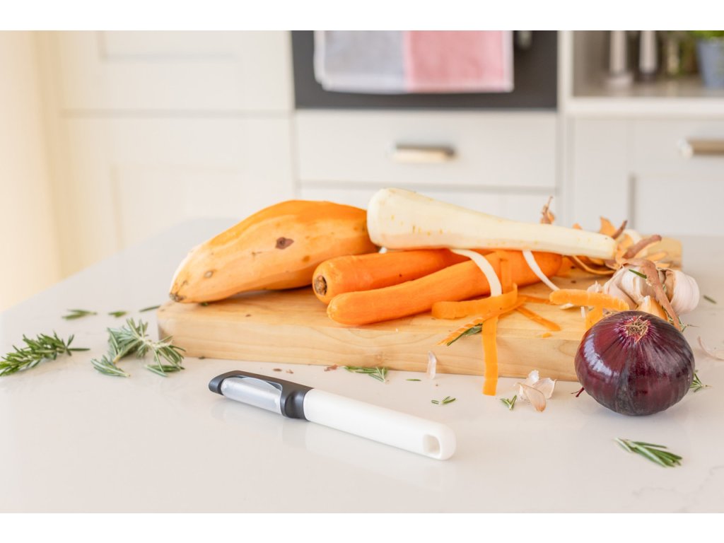 Ergonomická rukojeť v porcelánově bílé barvě poskytuje komfortní úchop i při delší práci, a přitom působí svěže a nadčasově. Tato škrabka je vhodná pro oloupání brambor, mrkve, okurek i jablek a dalších podobných surovin.
