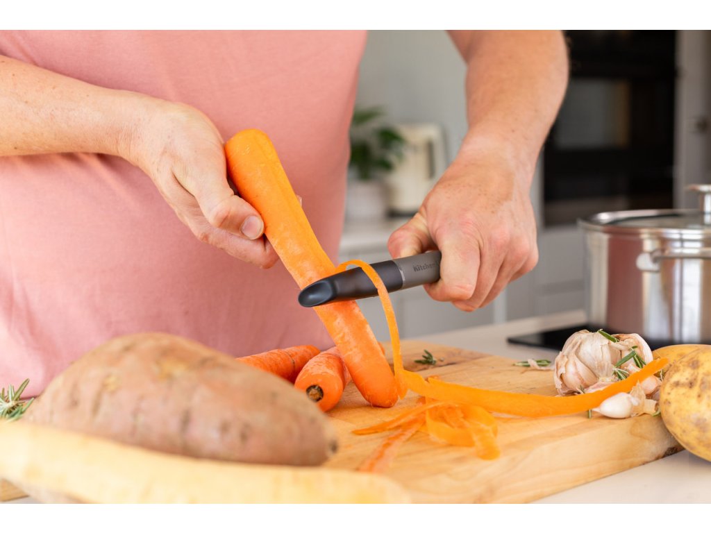 Uhlově šedá podélná zubatá škrabka KitchenAid 20 cm spojuje praktičnost s moderním designem. Je navržena tak, aby díky zubatému ostří snadno oloupala i pevnější slupky zeleniny a ovoce, a zároveň minimalizovala námahu při práci.