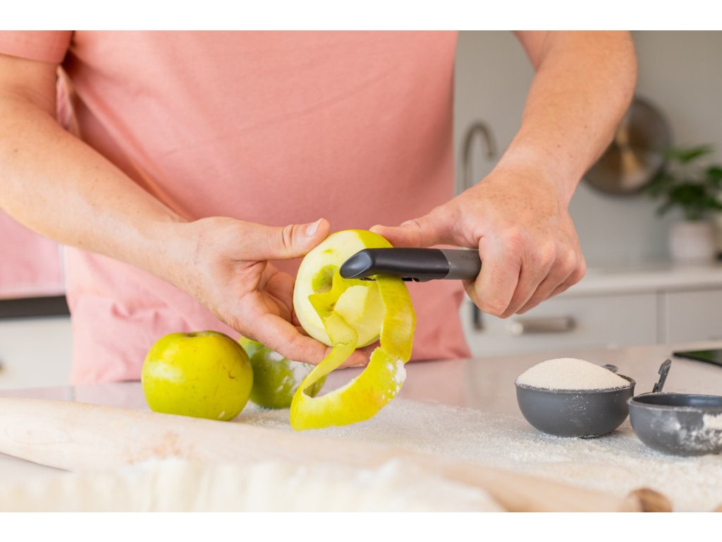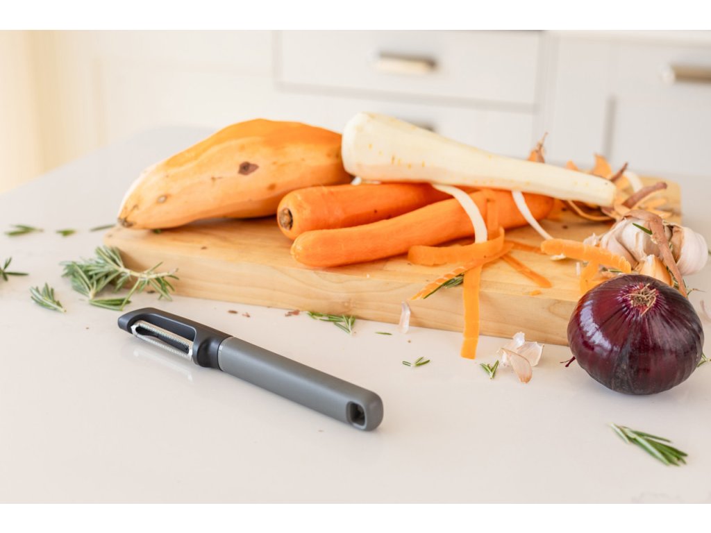 Ergonomicky tvarovaná rukojeť v uhlově šedé barvě zajišťuje pohodlný úchop a stabilitu při manipulaci, což je výhodou i při delší přípravě surovin. Škrabka je vhodná pro různé druhy surovin – od brambor přes okurky až po jablka a další ovoce.