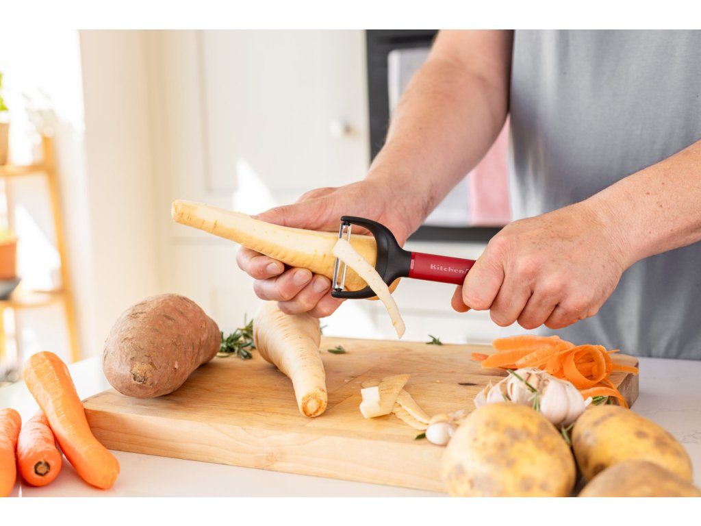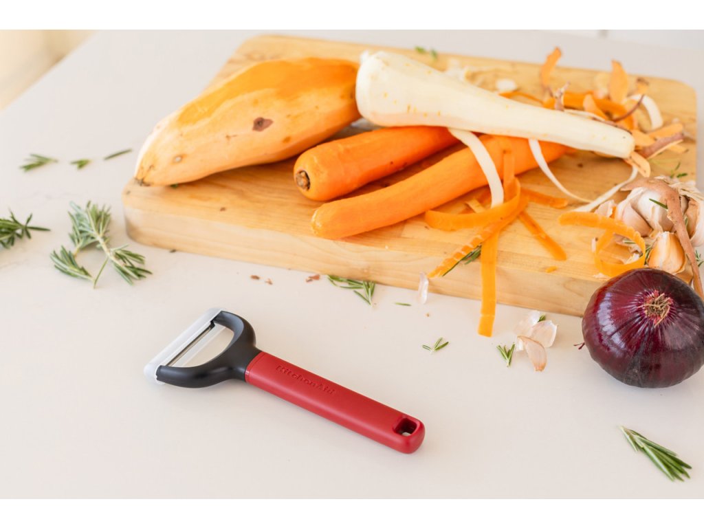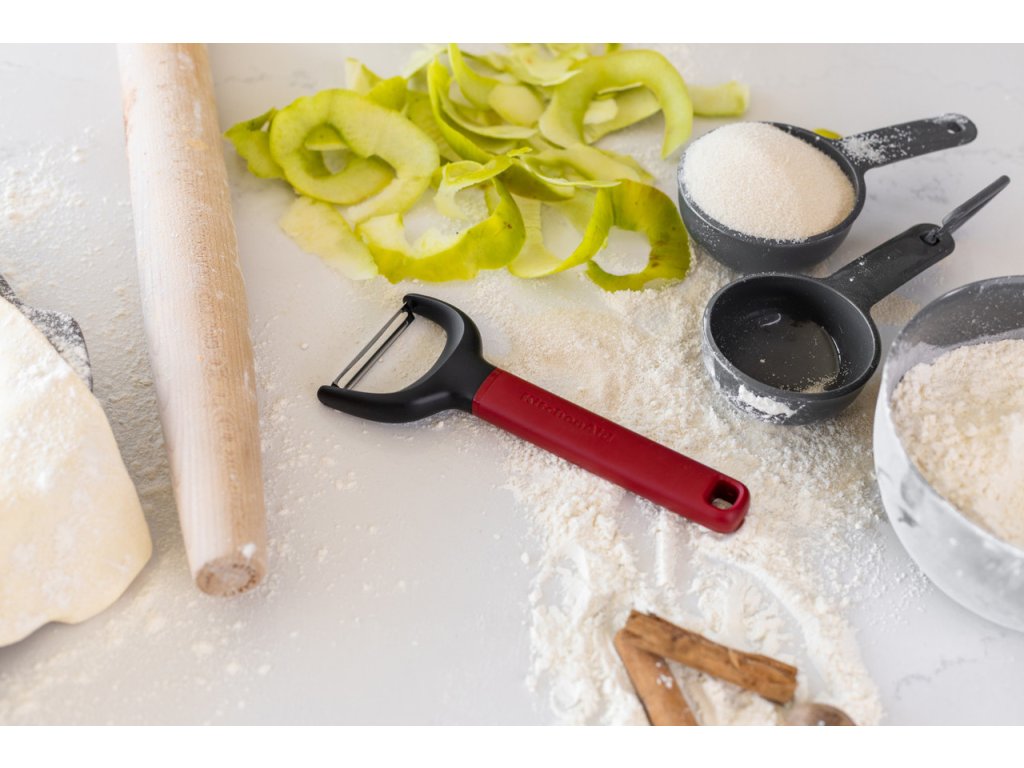Příčná škrabka KitchenAid 17,5 cm v červené barvě Empire Red je spolehlivý kuchyňský nástroj určený pro pohodlné a přesné oloupání zeleniny i ovoce. Díky ostré čepeli zvládneš snadno odstranit slupku z brambor, mrkve, okurek, jablek nebo jiných surovin bez zbytečného úsilí, a to i při častém použití.