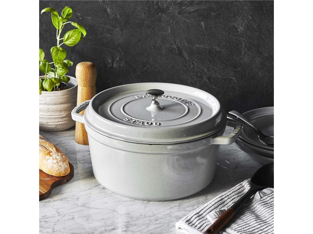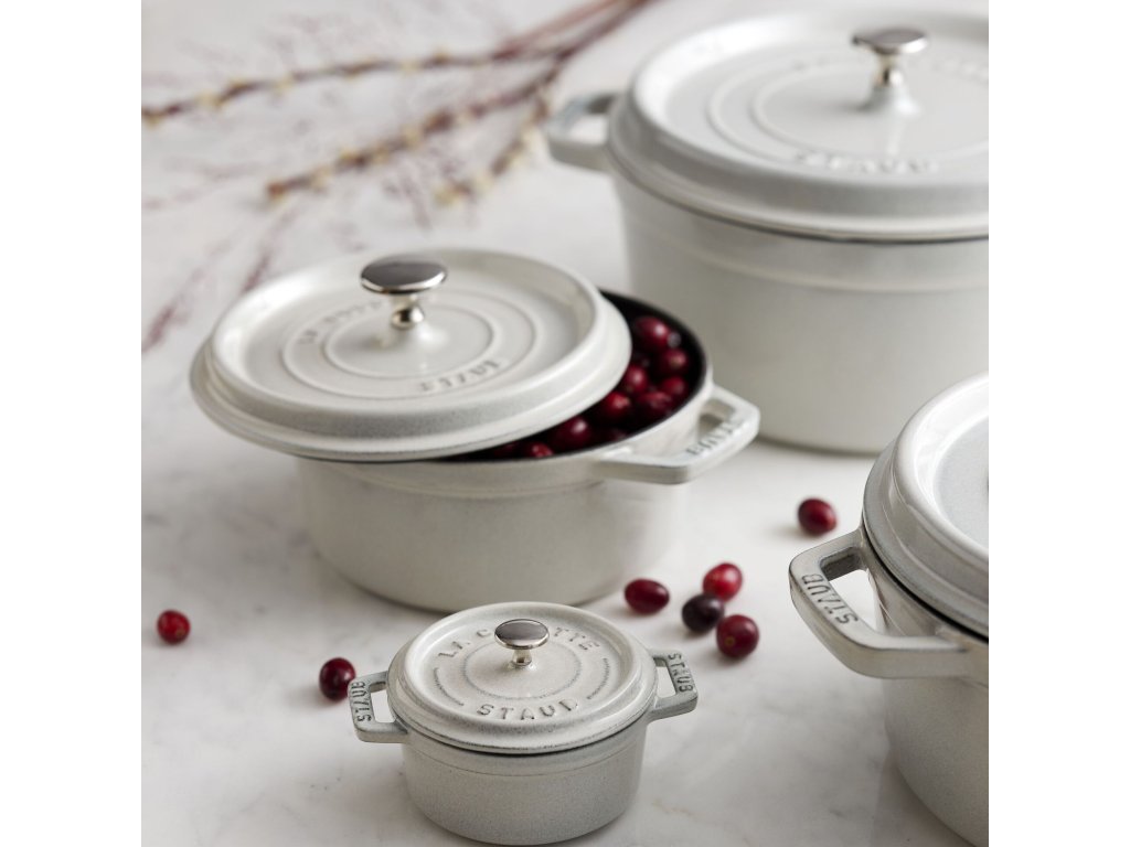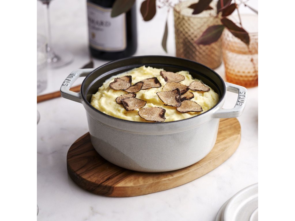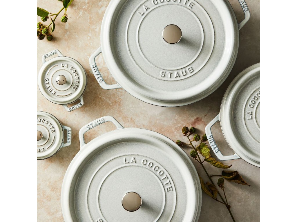 Tato velikost je zlatým středem mezi menšími a většími hrnci Staub – dostatečně prostorná pro všední rodinné vaření, ale zároveň skladná a lehčí na manipulaci. Barva Truffe Blanche dodává vaření i servírování luxusní vzhled. Cocotte je h
