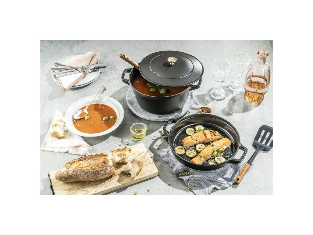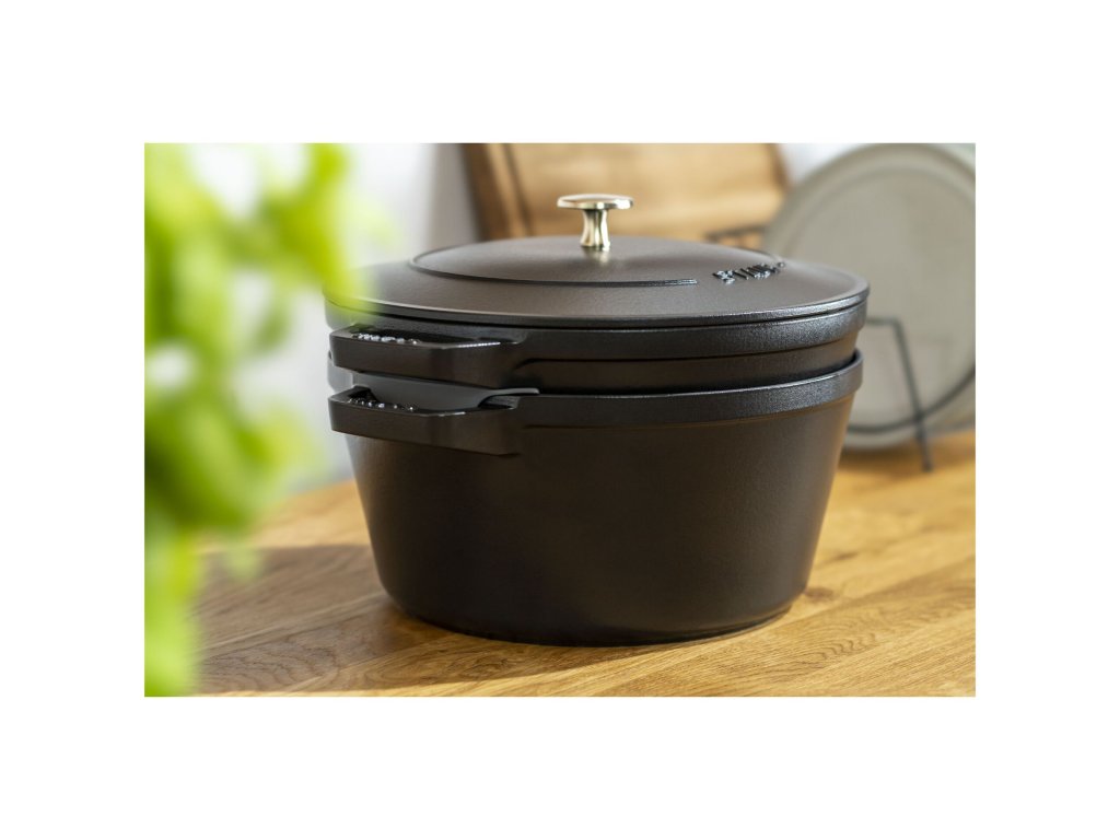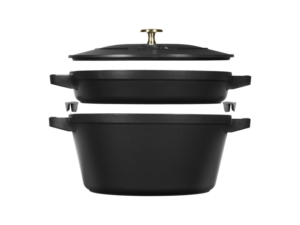 Černý mat je ikonická barva značky Staub. Profesionální, elegantní a dokonale univerzální. Tato stohovatelná sada je ideální volbou pro ty, kteří chtějí maximální výkon, dlouhou životnost a přitom šetřit místem. Nabízí skutečný „all-in-one“ koncept – jeden set, stovky receptů, minimální nároky na skladování.