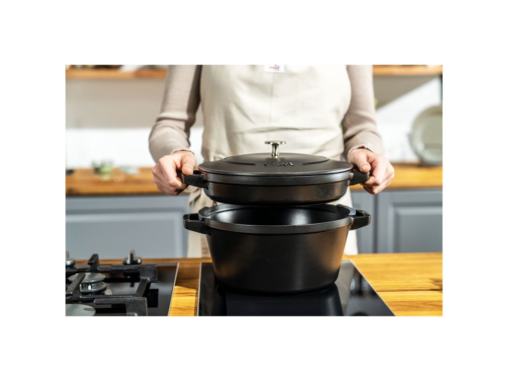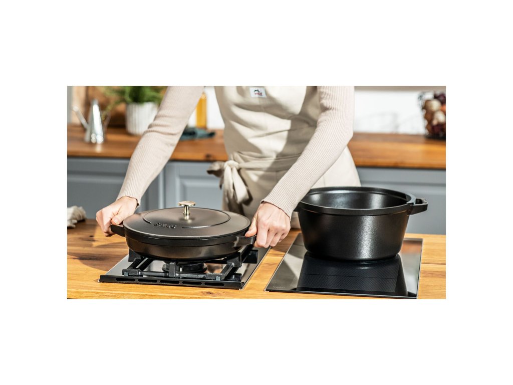 Černý matný smalt je nejen elegantní, ale také nejuniverzálnější povrch pro každodenní vaření. Díky své odolnosti je vhodný pro vysoké teploty, prudké restování i dlouhé dušení. Barva nepodléhá změnám, neodírá se a je ideální také pro servírování jídel přímo na stůl.
