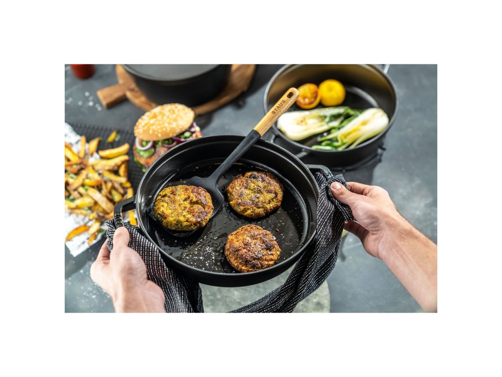 Vnitřní povrch tvoří vysoce odolný černý matný smalt, který je navržený tak, aby vytvářel maximální chuťový profil – perfektní opečení, rychlou karamelizaci, pevnou strukturu masa a zároveň krásné šťávy pro omáčky. Nádobí se po zahřátí chová jako teplotní akumulátor – udrží teplotu a postupně ji rovnoměrně uvolňuje.
