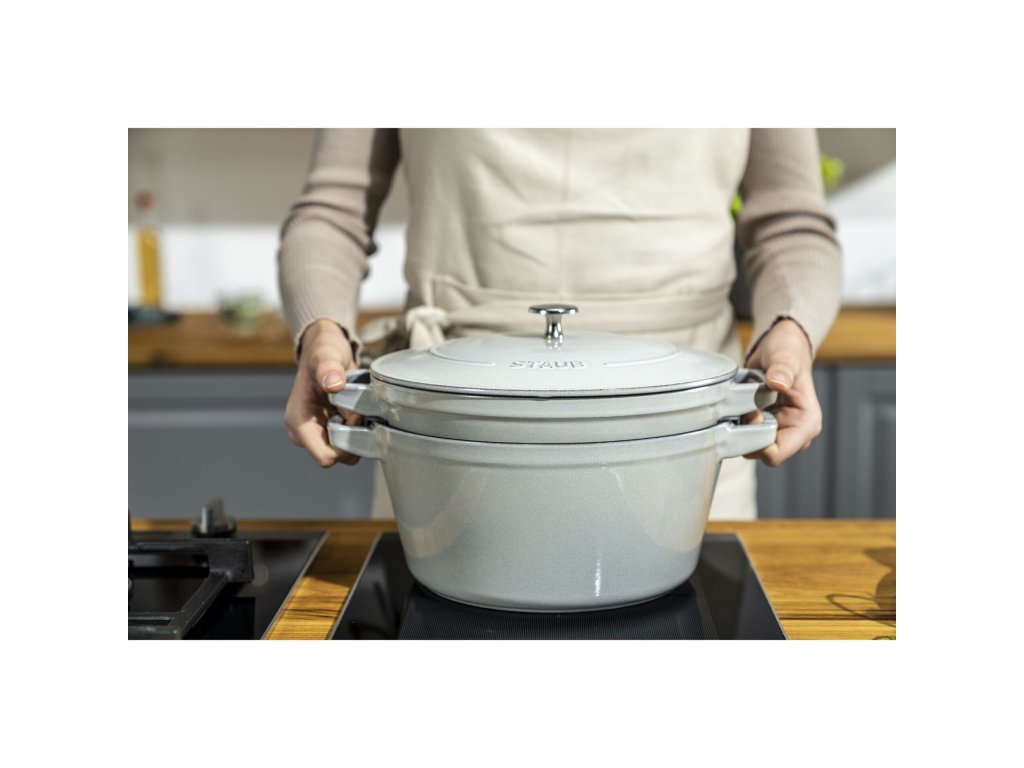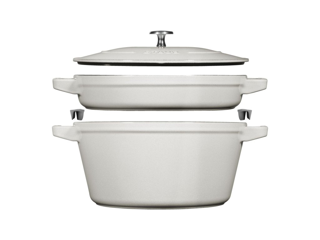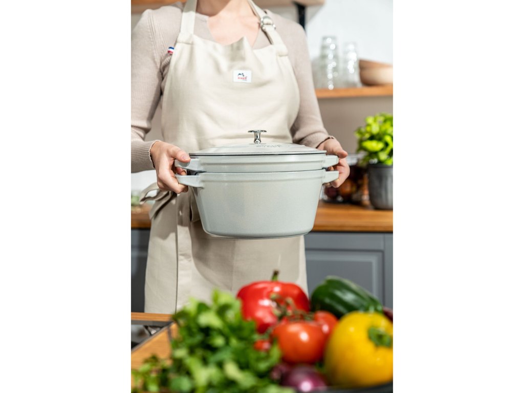 Sada STAUB Stackable 2+1 Ø 24 cm v elegantním odstínu Bílý lanýž (Truffe Blanche) je ideálním řešením pro moderní kuchyně, kde se snoubí špičkový výkon s promyšleným využitím prostoru. Tato sada obsahuje cocottu 24 cm, pánev 24 cm a univerzální poklici, díky čemuž získáte tři nejdůležitější kusy litinového nádobí v jednom designově sjednoceném celku. Díky stohovatelnému provedení zaberou po uložení jen minimum prostoru a přitom nabídnou neomezené možnosti při vaření.