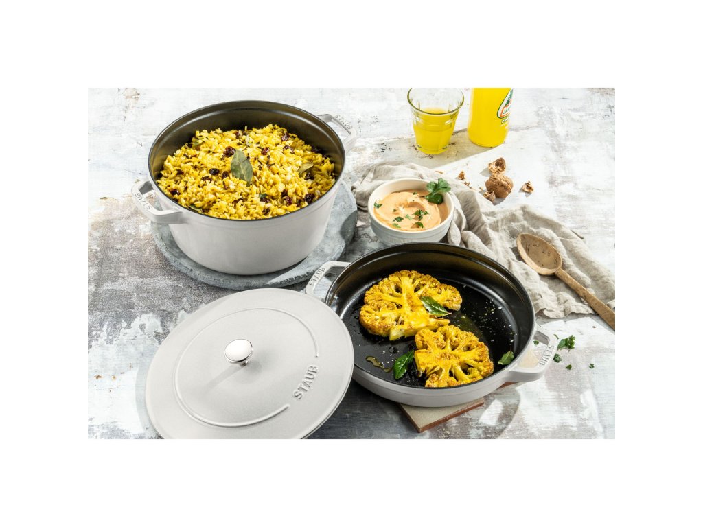 Litinový hrnec a pánev STAUB s poklicí, sada 2v1 Ø 24 cm bílý lanýž