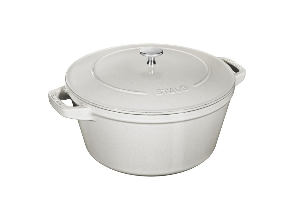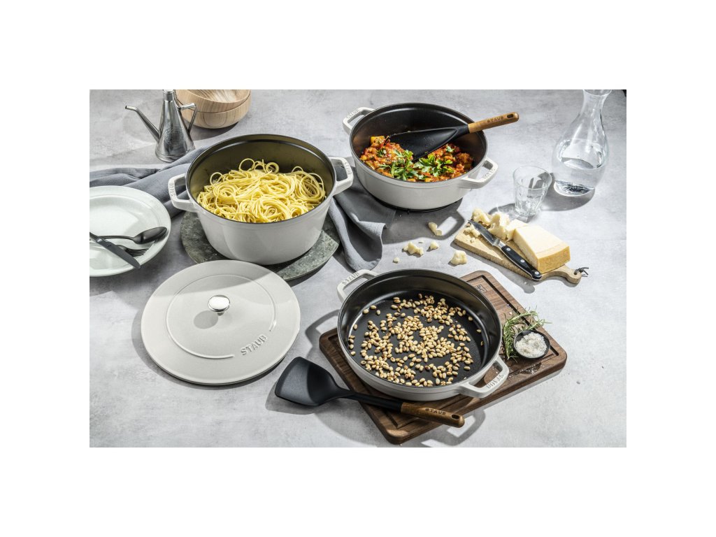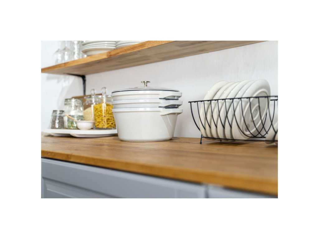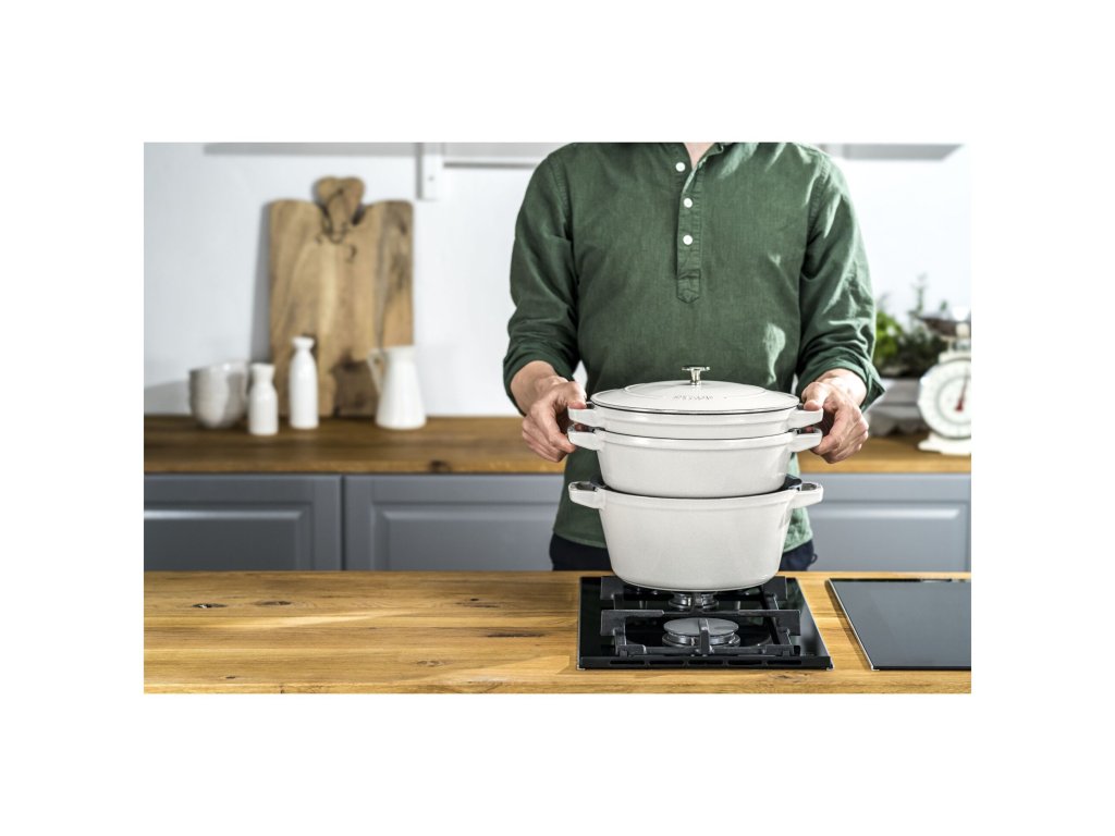 Tato sada nahradí hned několik kusů nádobí, přitom v kuchyni působí elegantně a nezabere skoro žádné místo. Bílý lanýž patří k nejhezčím a nejelegantnějším odstínům značky Staub a snadno jej sladíte se zbytkem kuchyně. Díky různým výškám a tvarům nádob zvládnete jemné omáčky, rychlé večeře i velkolepé pečeně v jednom setu. Je to krásný, praktický a mimořádně odolný základ, který poslouží celý život.