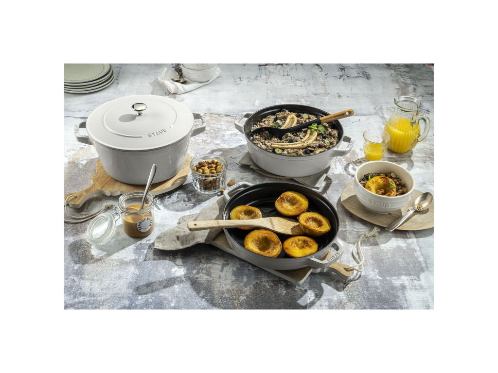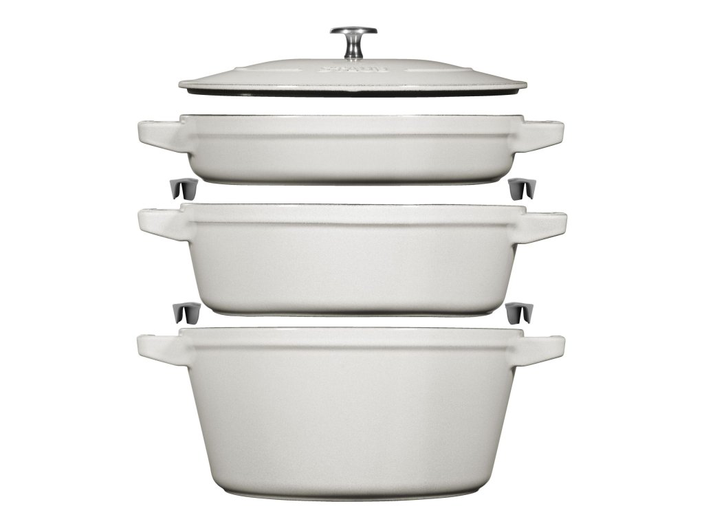 Sada STAUB 3+1 Ø 24 cm v odstínu Bílý lanýž patří mezi nejuniverzálnější a nejkrásnější sety litinového nádobí, které lze mít doma. Spojuje cocottu 24 cm, pánev 24 cm, litinový kastrol 24 cm a společnou poklici, která přesně pasuje na všechny tři nádoby. Díky možnosti ukládání na sebe zabere celý set překvapivě málo místa, přesto nabízí obrovské možnosti při vaření, dušení, restování i pečení.