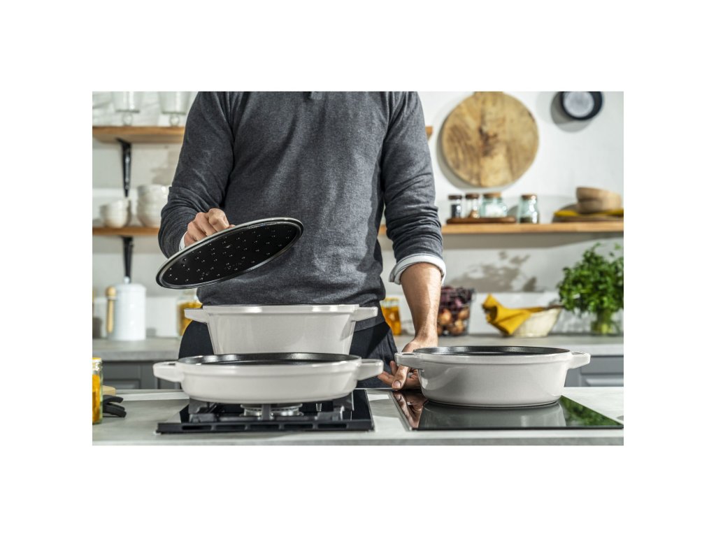 Celý set je vyroben z robustní litiny, která zvládá nejvyšší teploty a lze ji bez omezení používat na: