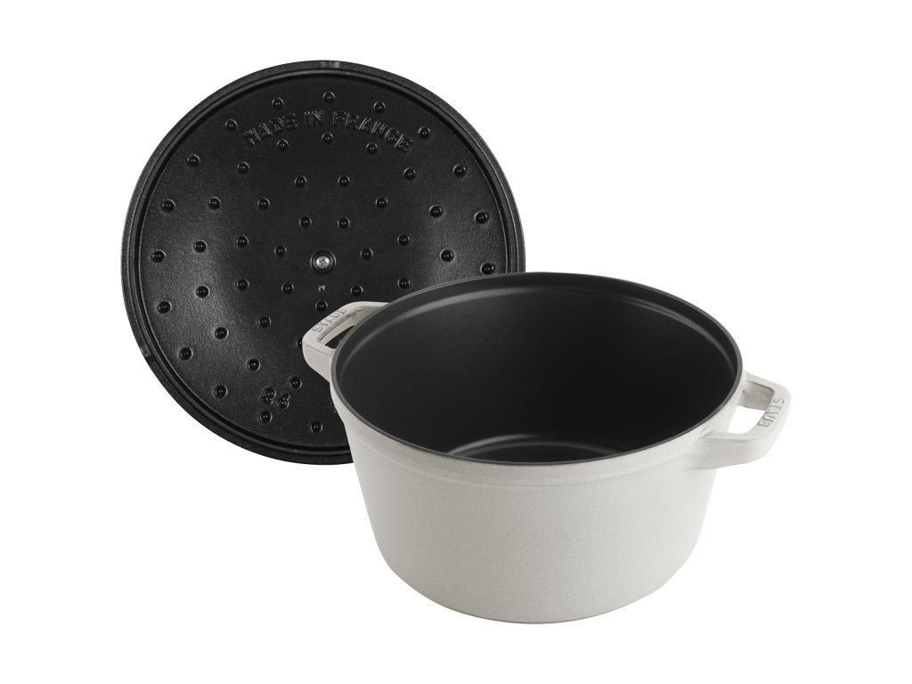 Spodní strana poklice je vybavena systémem picots® – malými výstupky, které vrací zkondenzovanou páru zpět na pokrm. Jídlo se tak průběžně podlévá samo, nevysychá a chuť se rovnoměrně rozvíjí. Tato technologie je typická pro nejlepší hrnce Staub a zásadně ovlivňuje šťavnatost hotového pokrmu.