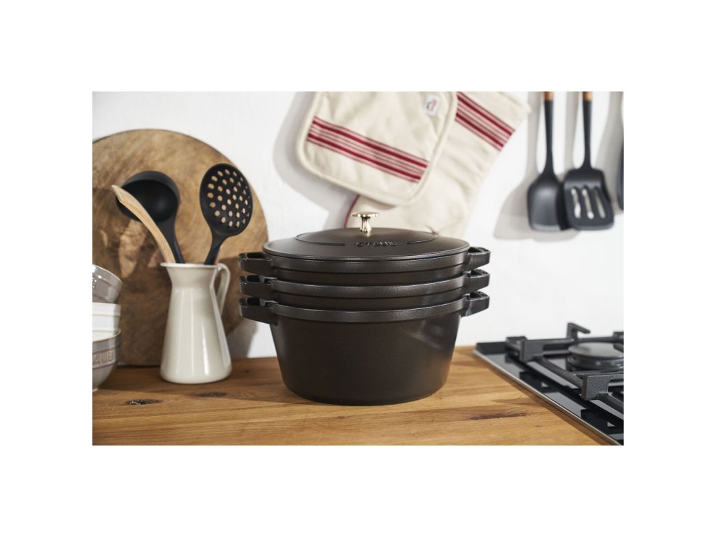 Černá litina je ikonou značky STAUB a patří k nejprodávanějším variantám. Působí profesionálně, hodí se do každé kuchyně a nikdy nevyjde z módy. Sada 3+1 nabízí vše, co běžná domácnost potřebuje: pánev, kastrol, velký hrnec a jednu univerzální poklici. Přitom zabere minimum prostoru a poskytne maximální výkon i dlouhou životnost.