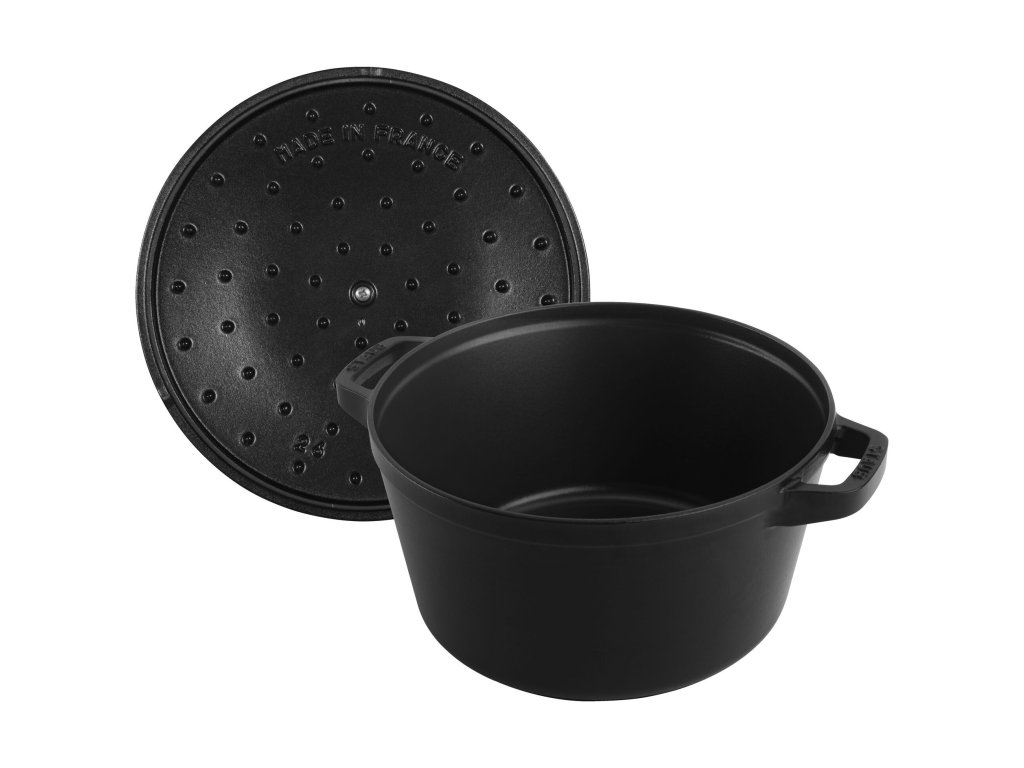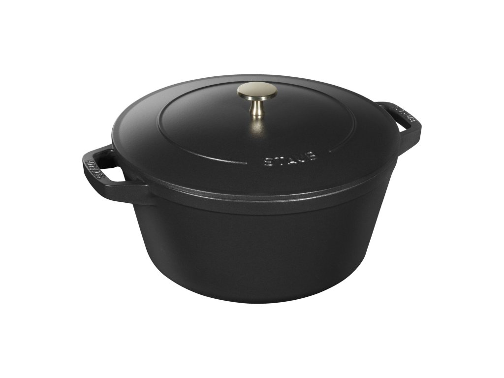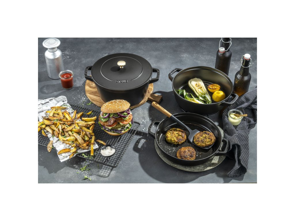 Černá litina je podpisovým prvkem Staub. Působí profesionálně, čistě a hodí se do jakékoliv kuchyně. Matně černý smalt je odolný proti opotřebení, nepodléhá změnám barvy a při servírování vytváří krásný kontrast s barvami pokrmů.