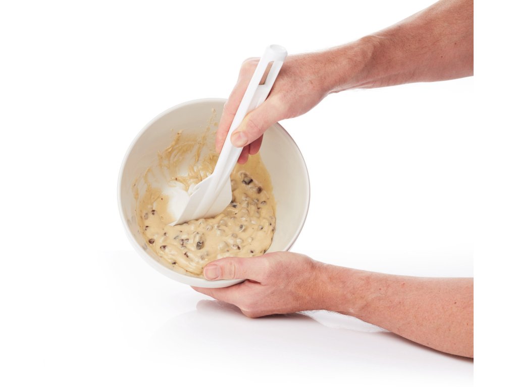 Promyšlený tvar stěrky umožňuje plynulý pohyb po povrchu nádoby a kopíruje její křivky. To je zásadní zejména při práci s těsty, krémy, polevami nebo hutnějšími směsmi, které mají tendenci zůstávat na stěnách nebo na drátech metly. Stěrka se ohne přesně podle potřeby, aniž by ztratila kontrolu nebo stabilitu.