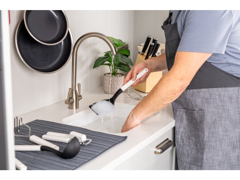 Materiál je navržen pro každodenní použití a údržba je velmi jednoduchá – po použití stačí podložky nechat okapat nebo je snadno vyprat v pračce. Černě šedé provedení se dobře hodí k moderním kuchyňským doplňkům a ladí s další výbavou značky KitchenAid.