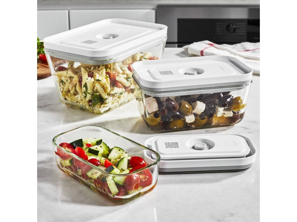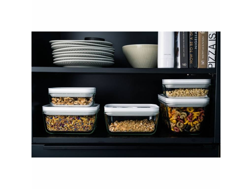 Vakuovací skleněná dóza Zwilling Fresh & Save velikosti L je vyrobena z odolného borosilikátového varného skla. Dóza je díky své univerzálnosti vhodná na uskladnění všech druhů suchých i tekutých potravin ve spíži, čerstvých potravin a hotových jídel v chladničce, ale také v mrazničce. Dóza je dokonale vzduchotěsná i vodotěsná, nehrozí tedy žádný přenos vůní do okolí. Po odsátí vzduchu bezdrátovou pumpou Zwilling Fresh & Save prodloužíte čerstvost až 5 násobně. Doporučujeme zvýhodněnou sadu Vakuovací pumpy, 2 dóz a opakovaně použitelných 3 sáčků.