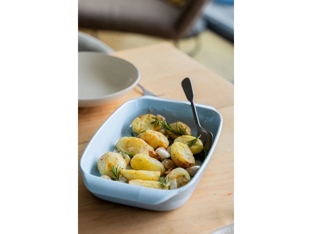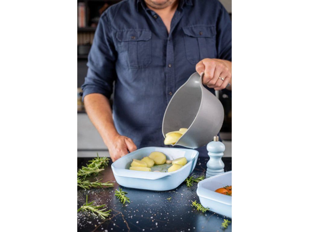 Světle modrá glazura působí čistě a moderně, díky čemuž můžete mísu po upečení použít i pro servírování přímo na stůl. Spojuje praktickou funkci pečicí nádoby s vizuálně příjemným designem.