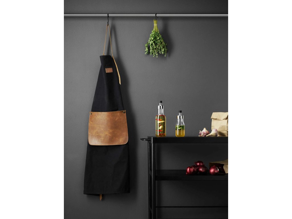 | Klíčové vlastnosti: | Pevné černé plátno doplněné pravou kůžíKožená kapsa a poutko na kuchyňské náčiníOdnímatelné kožené části pro snadné praníNastavitelná velikost vhodná pro každéhoPlátěnou část lze prát na 30 °CStylové provedení které časem získá patinu |